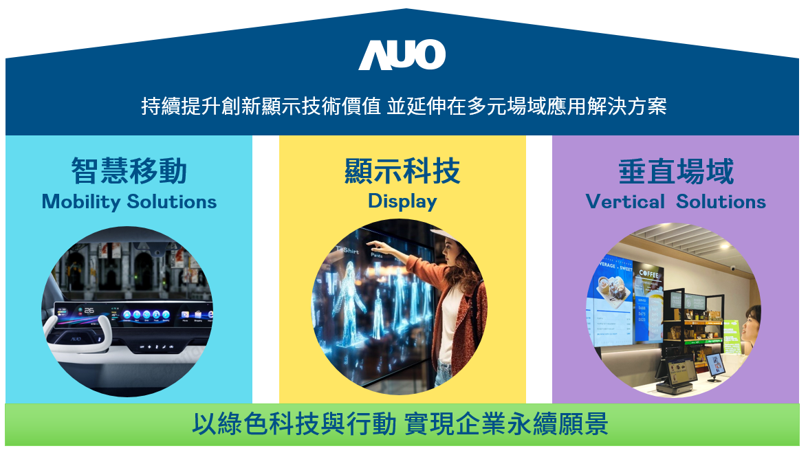 我們持續推動「雙軸轉型」,在精進顯示技術附加價值(Go Premium),與深化垂直市場應用(Go Vertical)的策略下,對應DB旗舰的優勢競爭力與趨勢,我們奠定顯示技術智慧移動垂直場域三大永續營運支柱,在顯示技術領域的根基之上,延伸布局多元場域應用解決方案。將先進顯示科技助力智慧移動及垂直場域發展,並以綠色科技與行動為實踐,在轉型之路上貫徹永續經營之願景。